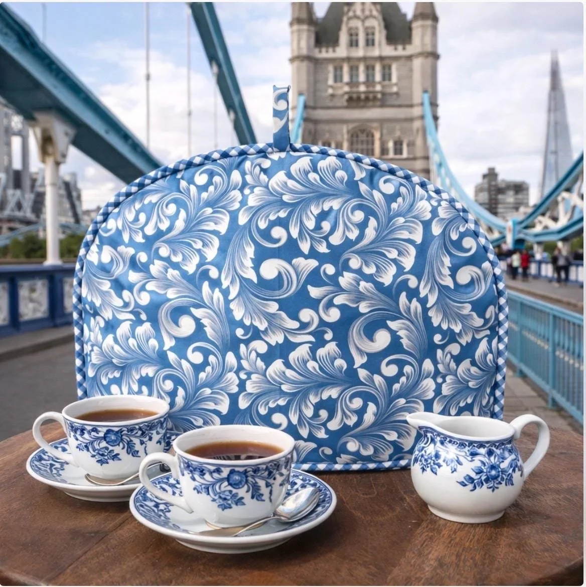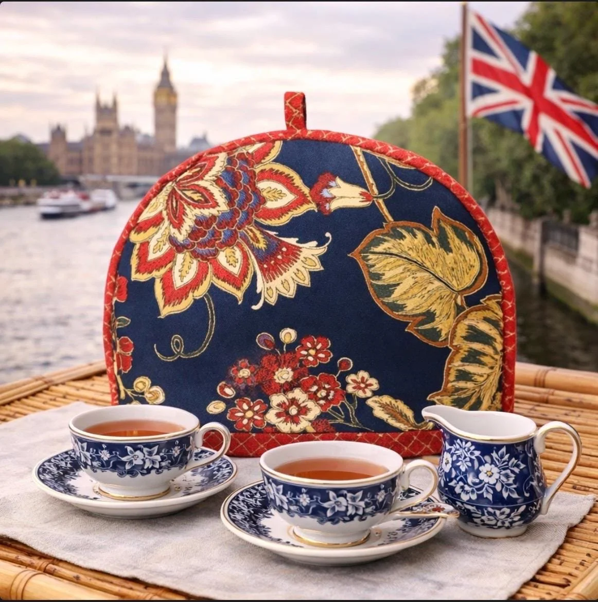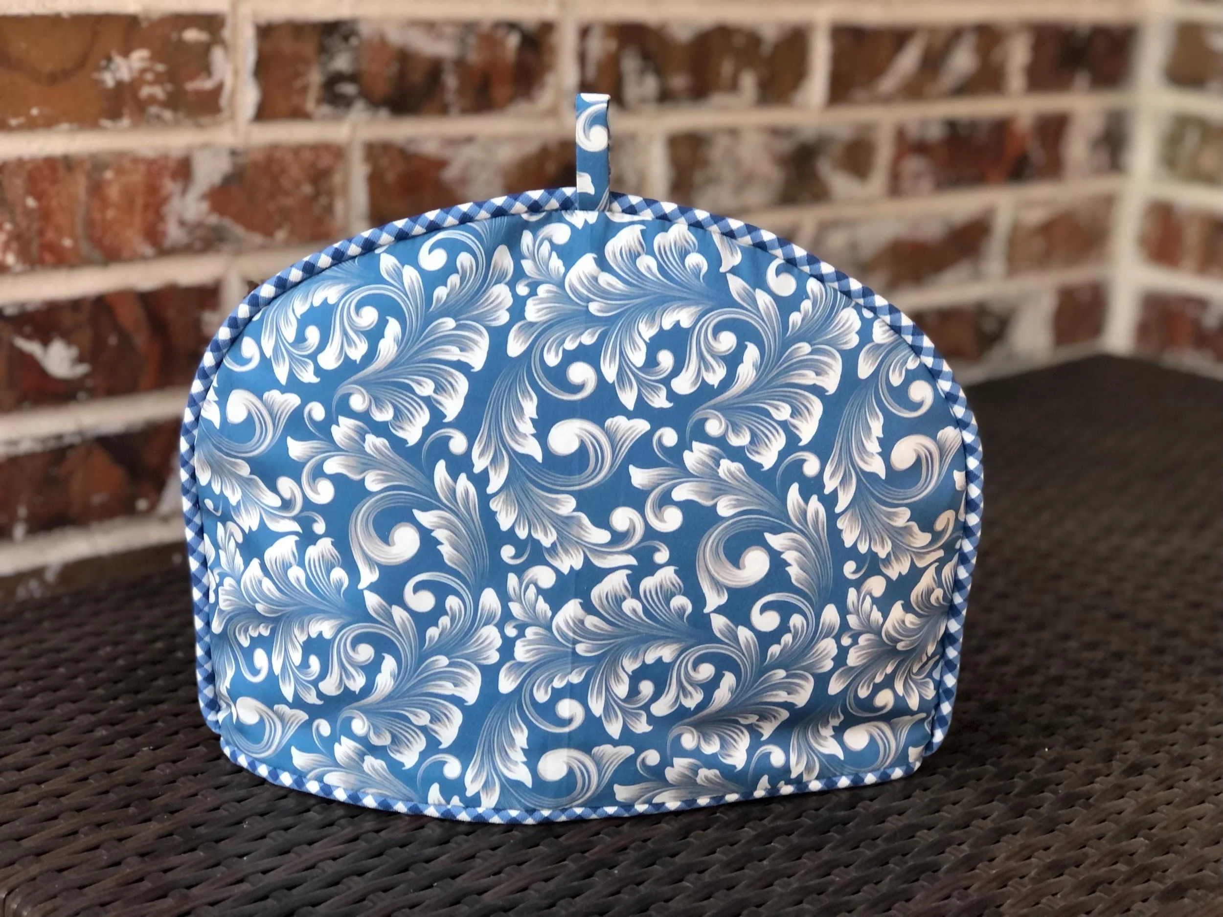 This elegant, meticulously handcrafted artisan tea cozy is constructed of decorator Waverly heavy cotton duck. Coordinated bias cut piping adorns both the top and the base of the cozy. Plushly filled with substantial cotton and poly fiber fill, it provides excellent heat retention.